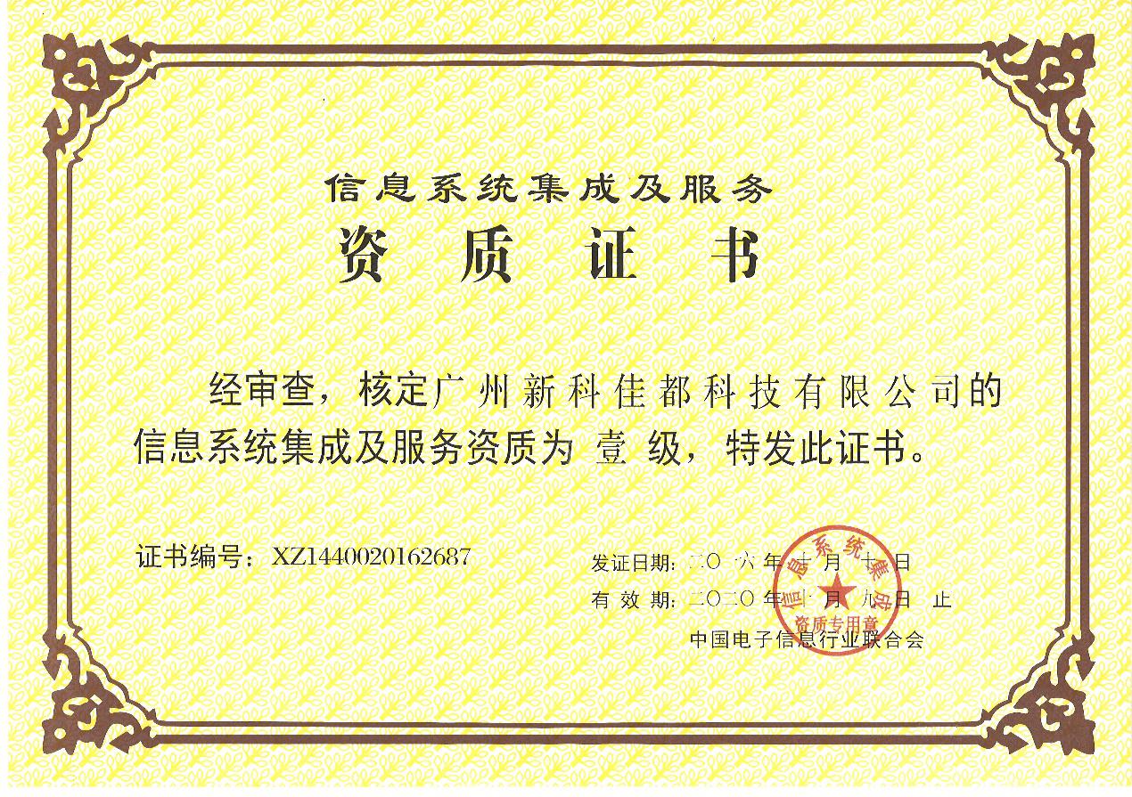 信息系统集成服务资质是目前国内对企业从事信息系统集成及服务综合能力水平最具专业性和权威性的评价,分为一级至四级,其中一级为最高等级。获得信息系统集成服务一级资质,标志着企业具备独立承担国家级、省部级、行业级、大型企业级等各类信息系统建设和运营能力。信息系统集成服务一级资质的认定条件非常严格,对企业的综合条件、财务状况、信誉、业绩、管理能力、技术实力、人才实力、服务水平、质量保证、技术装备等方面都具有很高的要求。在评审过程中,新科佳都以靓丽的经营业绩、强大的技术实力、完备的内部管理流程和体系、大规模研发投入及高速增长的集成服务业务等优异的综合实力,赢得了评审机构及现场审核专家的一致认可。