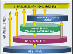 应用软件可以是基于硬件平台、操作系统、基础软件架构平台(比如J2EE中间件,Bea Weblogic, IBM WebSphere等)、业务基础软件平台这几个不同的层次来开发实现的。目前大多数应用软件开发商都是基于操作系统或基础软件架构平台这两个层次上来直接构建应用软件,而没有一个通用的、开放的、扩展能力强的业务软件开发平台来支持,比较难满足呼叫中心业务软件在个性化、灵活、可重用方面需求。