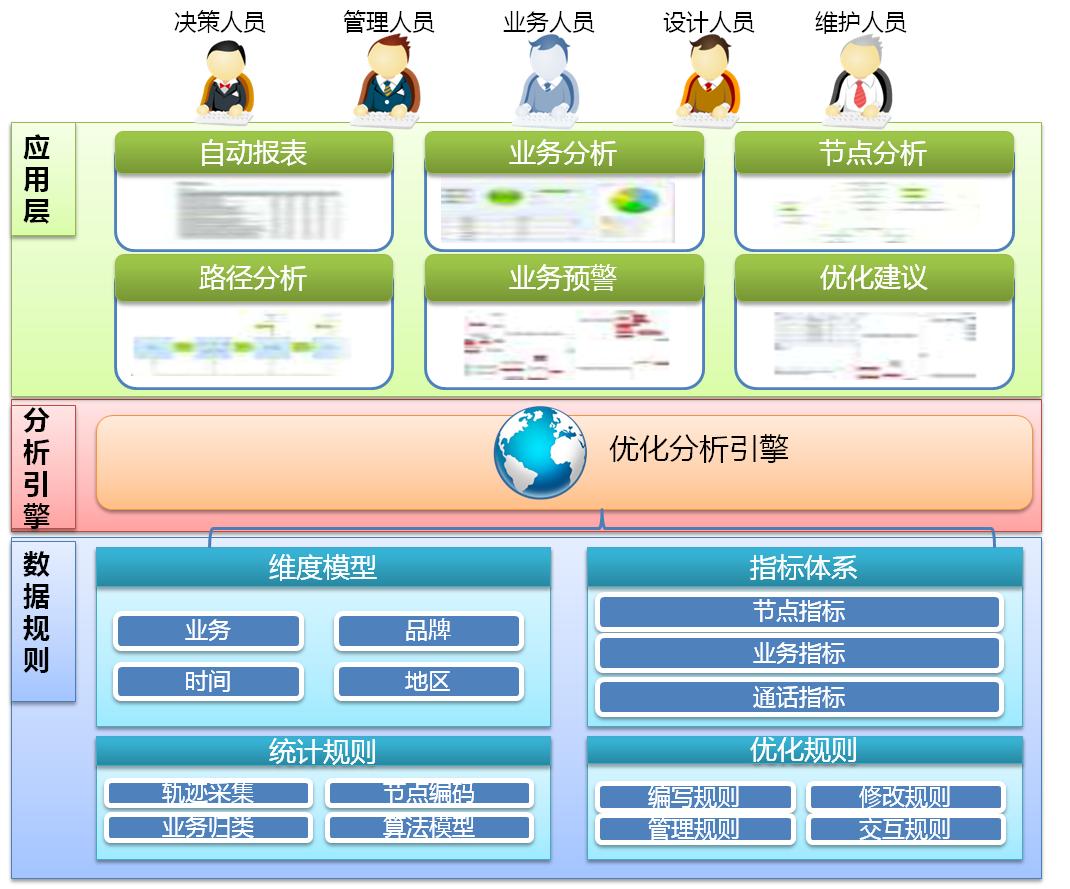 IVR流程优化分析系统构建了面向业务的IVR分析,通过定义冲浪率、直达率、有效率、成功率、失败率等一系列业务层面的指标,用图形化的方式展示每项业务的全面信息,使得用户能够在业务层次和以最自然的方式来分析语音菜单结构,更容易发现问题和解决问题。