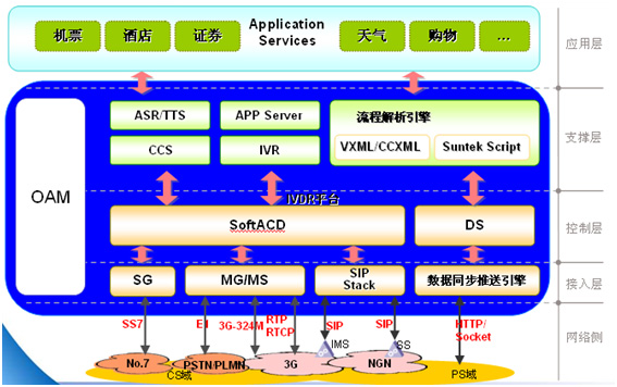 流程解析引擎支持VXML及SUNTEK Script流程语言,通过SCE集成开发环境,可以方便地定制开发动态语音流程。除实现IVR功能外,还可以通过数据链路同步向用户的终端推送数据,并通过终端软件的解析后展现在客户面前。