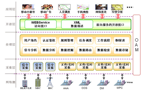 移动性动态数据业务支撑系统,可以分为五层结构,自下而上为网络层、采集层、处理层、开放层和应用层。网络层为大网数据侧,主要包括A接口信息和PSDN分组数据信息;数据采集层主要采用信令采集、实时消息接口和文件接口的数据采集;处理层将采集到的数据信息进行分类整理,提供不同的数据信息集合;开放层是面对不同的用户开放不同的用户数据,统一使用 WebService技术以XML定义应用层接口;应用层为具体的业务使用者,可以不需要了解复杂的数据采集和分析过程,仅通过和WEBservice接口获取数据信息来实现系统的功能,降低了开发成本。