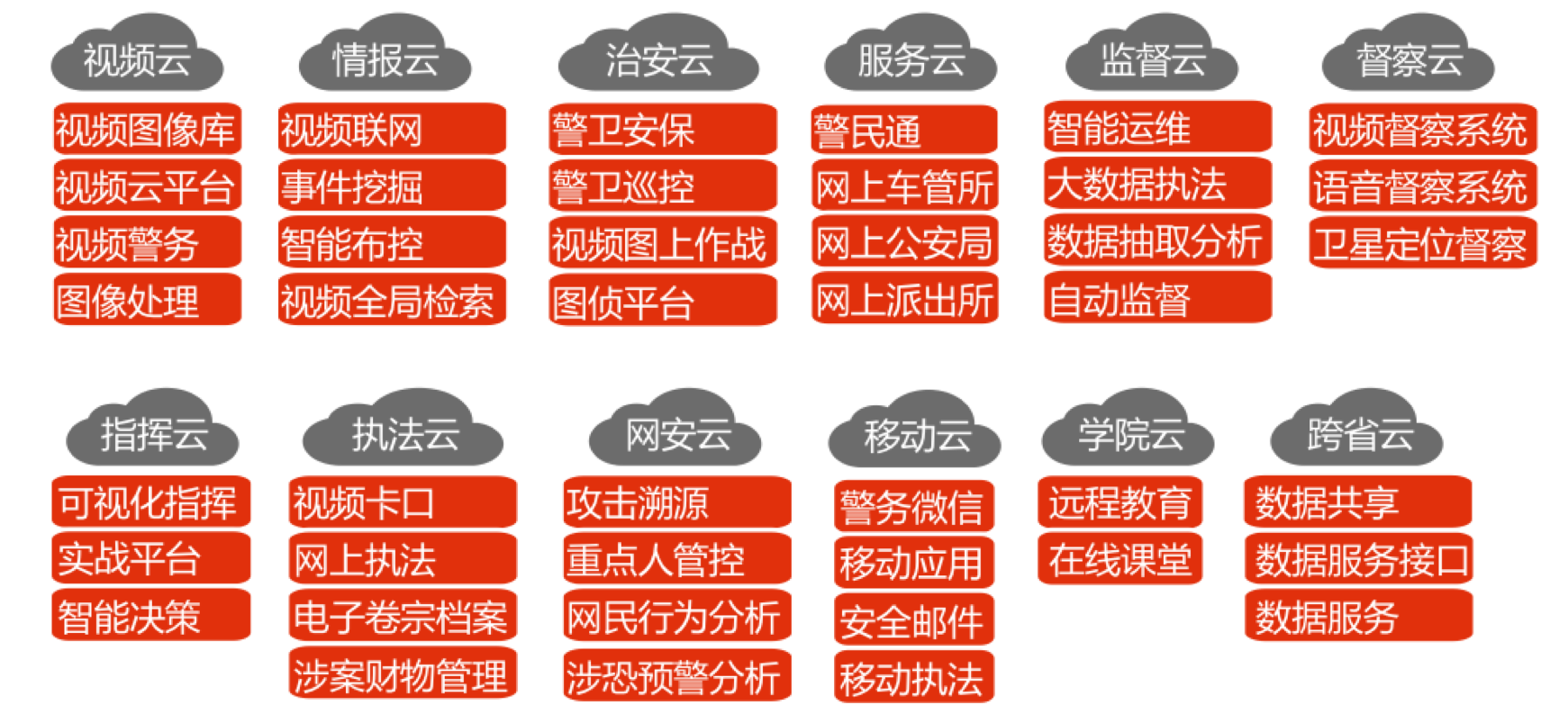 • “互联网+”行动计划、智慧城市建设给警务建设指明了方向,如何利用信息技术(IT)、数据技术(DT)实现公安业务的云化,建设警务云,包含视频云、情报云、治安云、服务云、监督云、督察云、指挥云、执法云、网安云、移动云、学院云、跨省云等12朵云。
